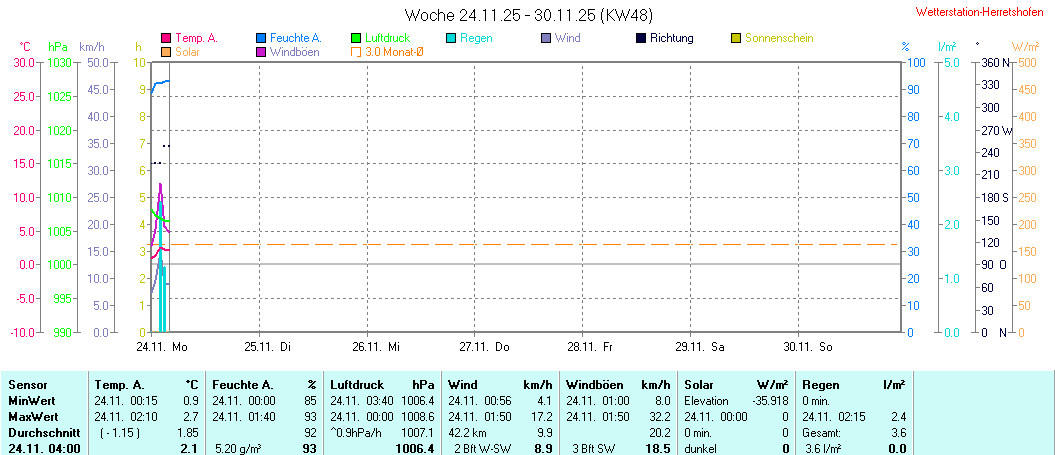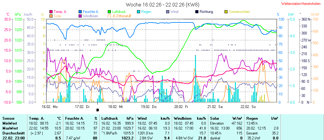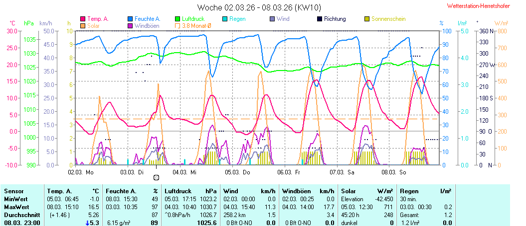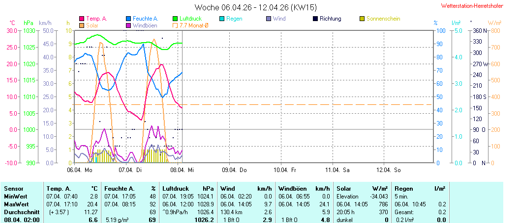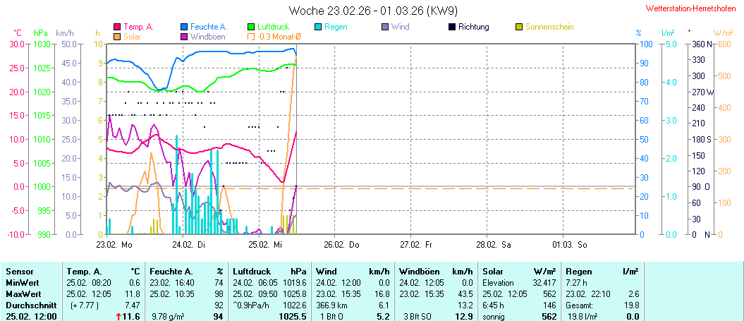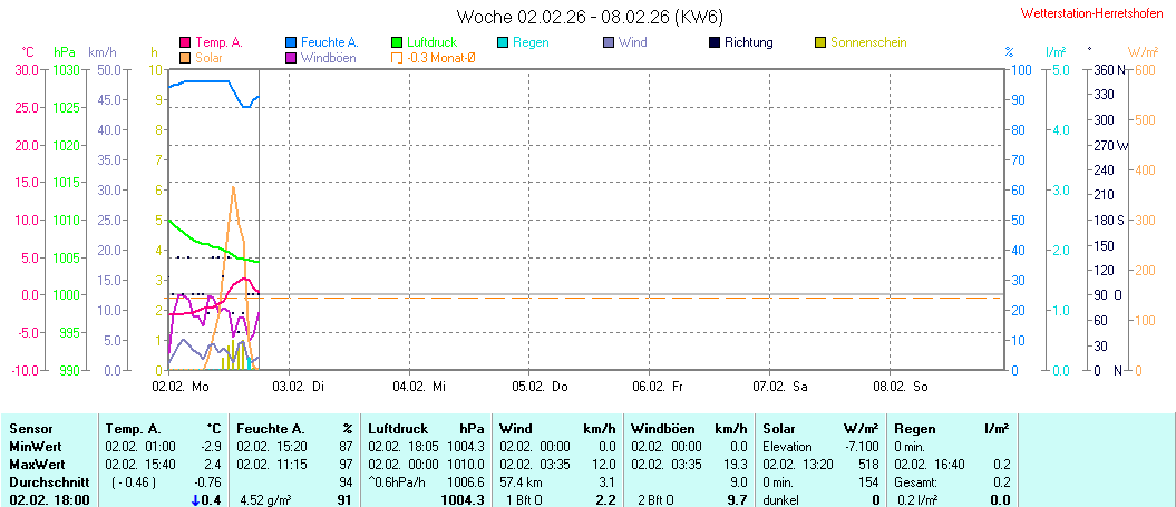 | Die dargestellten Werte repräsentieren die Daten des aktuellen Tages! Der Luftdruck ist auf Meereshöhe bezogen! |